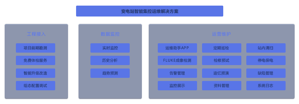 变电站智能集控运维解决方案以C/S、B/S架构搭建平台并且以IT+OT的技术模式来为客户提出解决方案,整个系统功能包括工程介入、数据监控和运营维护三大模块