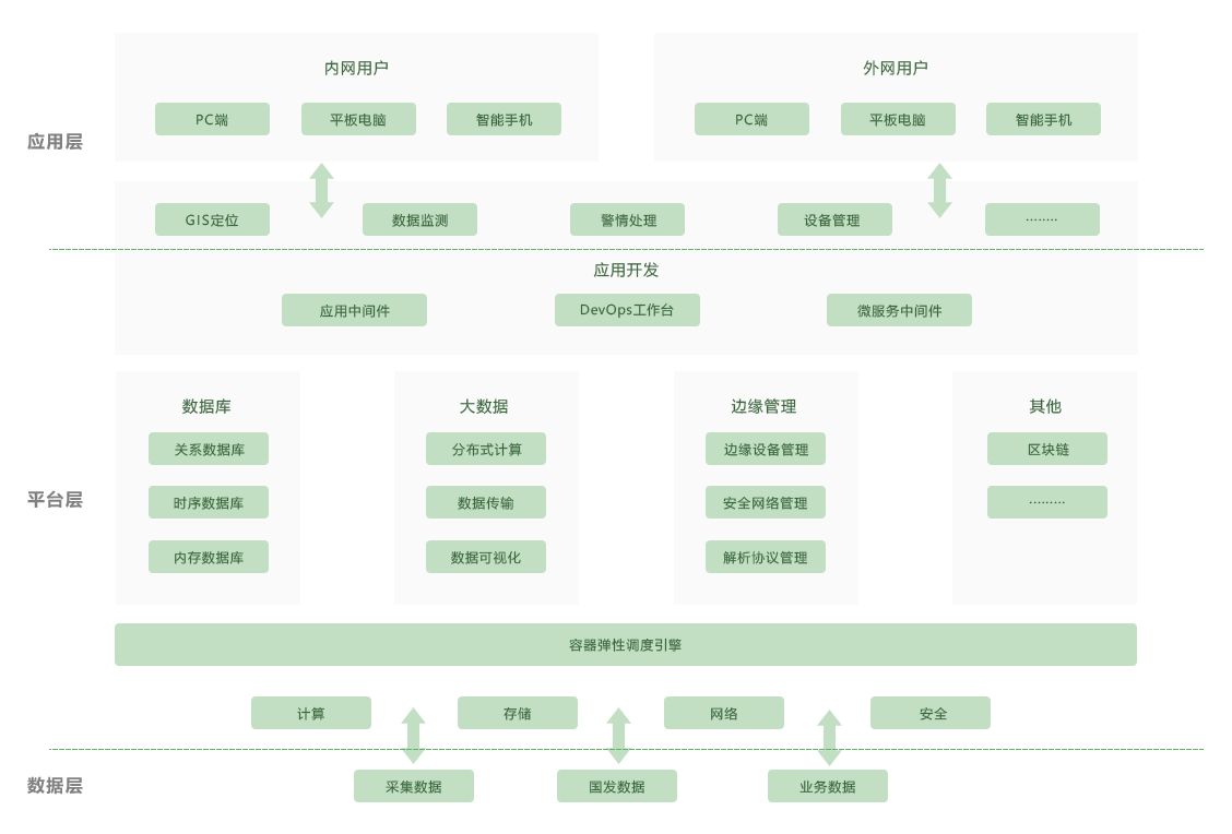 平台支撑层基于通用PaaS和工业PaaS服务搭建,给予面向特定场景的应用。给予相关数据服务接口、GIS地图、数据推送、分析模型、报表工具等。其中,通用PaaS给予云计算、大数据、应用开发、中间件、人工智能、区块链等基础PaaS服务能力。工业PaaS顺利获得Ebpay企业大脑产品,面向各个行业和领域,给予以数据为核心的工业数据服务、机理模型服务和业务微服务。使应用层的各个功能模块顺利获得Ebpay工业互联网平台对不同行业和领域服务,达到信息共享。