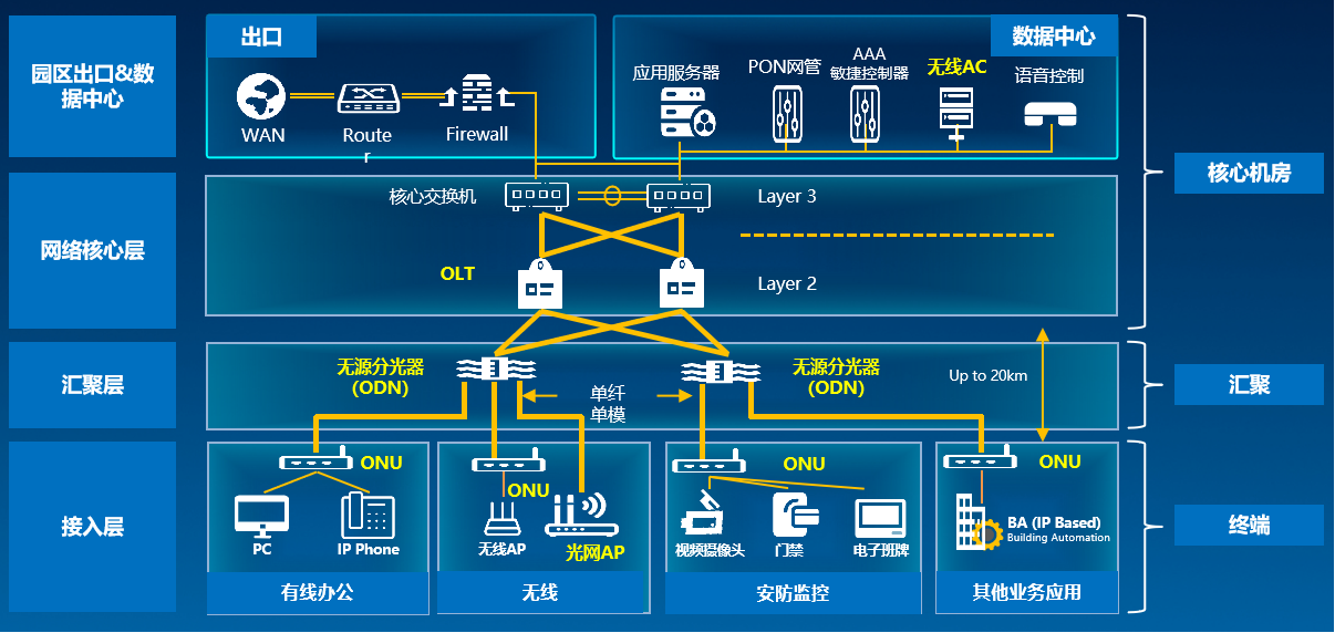 Ebpay全光网顺利获得各种形态的ONU设备给予有线网络接入,顺利获得室内、高密、室外、面板等各种型号AP和光AP为楼内用户给予无线网络接入