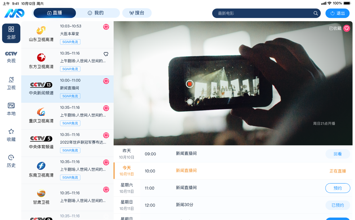 • 终端应用在5GNR广播基站信号覆盖范围内优先顺利获得5GNR广播播放直播节目的功能。同时为保证用户观看体验,在5GNR广播不可用、且双向网链接正常的情况下,终端允许用户顺利获得双向网络接收观看直播节目。